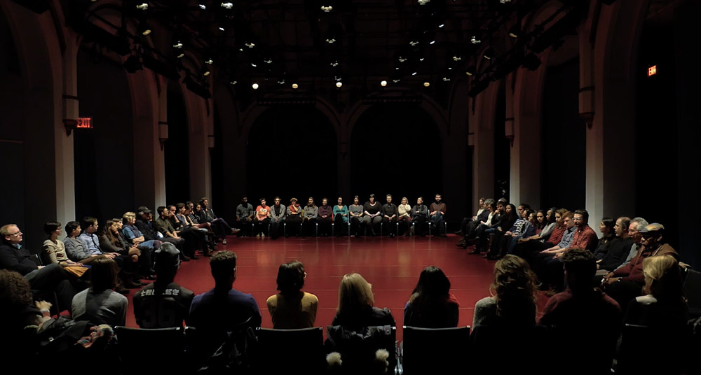 The first image pictures an audience from a bird’s eye view, seated in a large rectangle and facing towards the center of the space. The maroon-colored floor is decorated in the sheen and speckle of bright theater lights from above. This moment takes place after the audience gathers and sits, prior to any speaking.