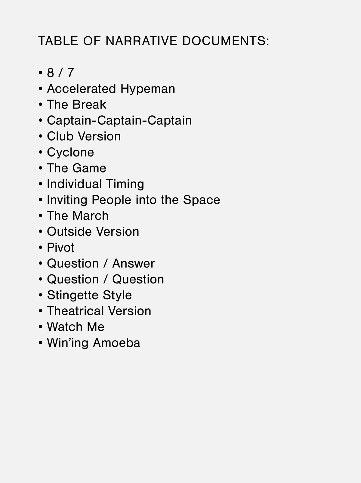In the “Table of Narrative Contents,” jumatatu provides a portal into their research of J-sette, emphasizing their interests in rhythm, pattern, and attention. In the complete document, these words hyperlink to a series of descriptions, videos, and notes revealing the world-building nature of this complex body of work, touching on aspects of the J-sette vernacular and the ways formations are coded with social belonging and potential.