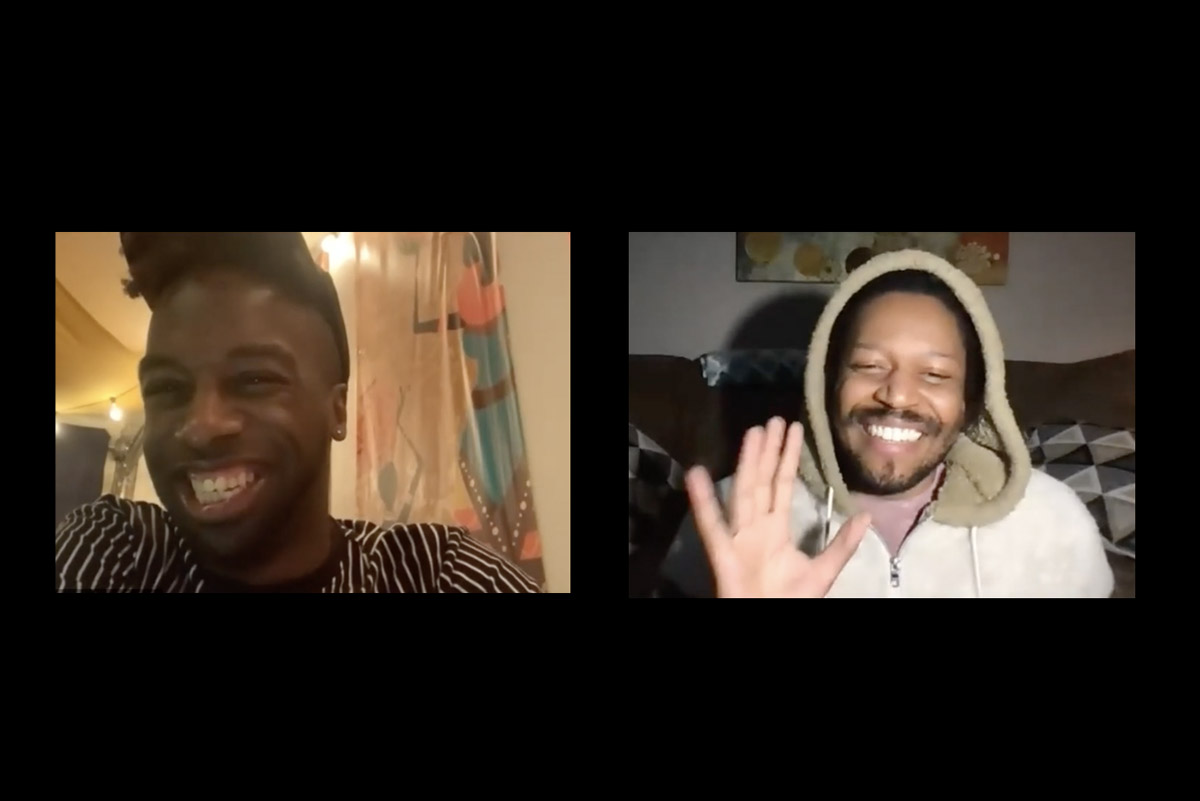 In the above video, jumatatu and Donte form a split screen, each sitting in their own living rooms. Smiling, they share a convivial moment between friends. jumatatu wears a two-toned furry hoodie draped around their head. Donte wears a black baseball cap and black-and-white vertical striped shirt. Towards the end of the recording, they share an impromptu duet, which jumatatu describes as a “queer slow jam… being slow together as a means to know about one another and ourselves.” A lyrical slow jam floods the space as they use their phones to multiply themselves.