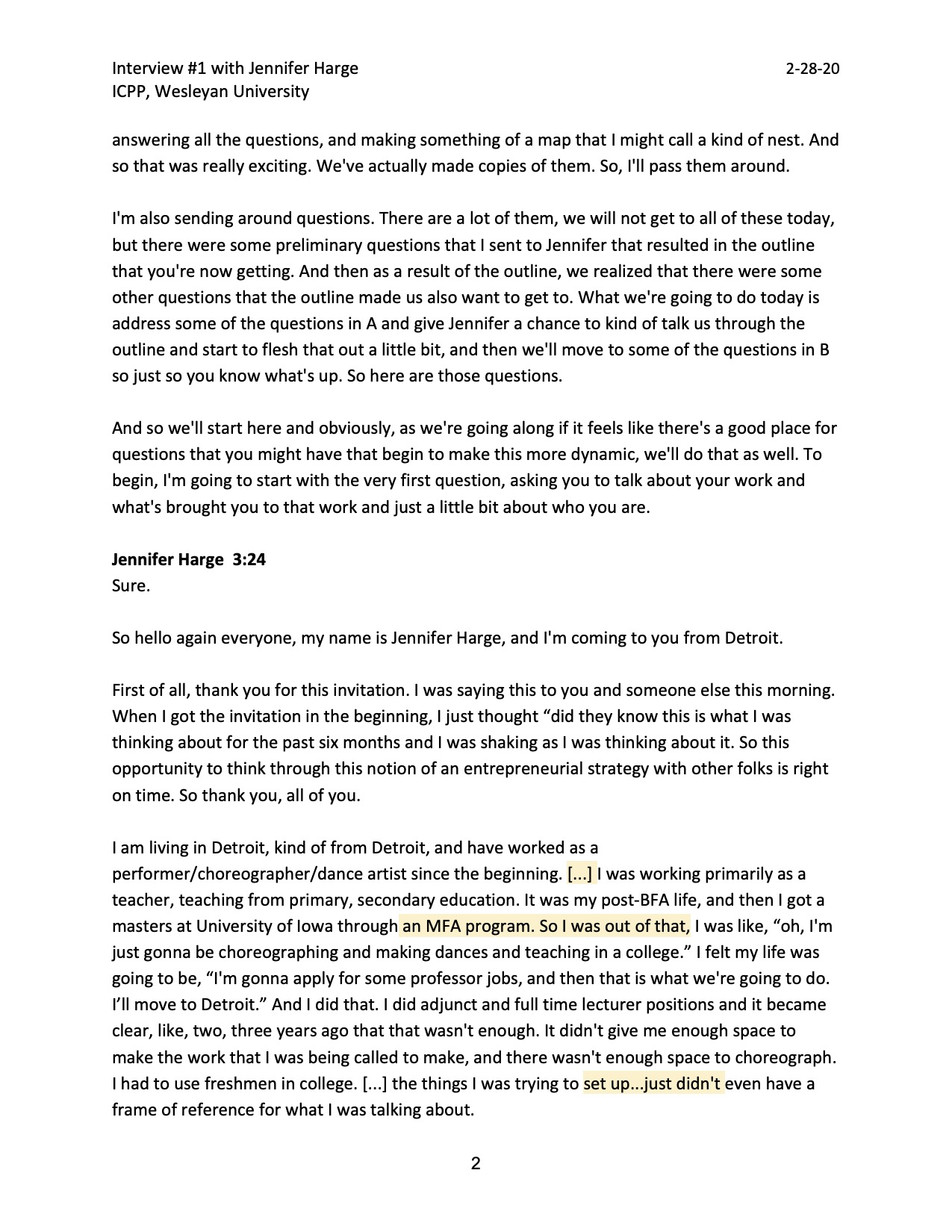 • Interview: ICPP Interview #1 with Jennifer Harge, Entrepreneurial Strategies, Wesleyan University, Friday, February 28, 2020 (transcript and audio recording; 1:41:45)