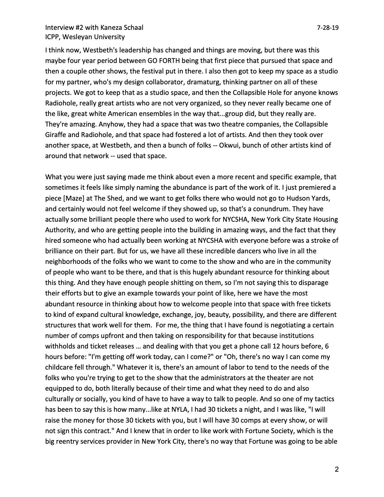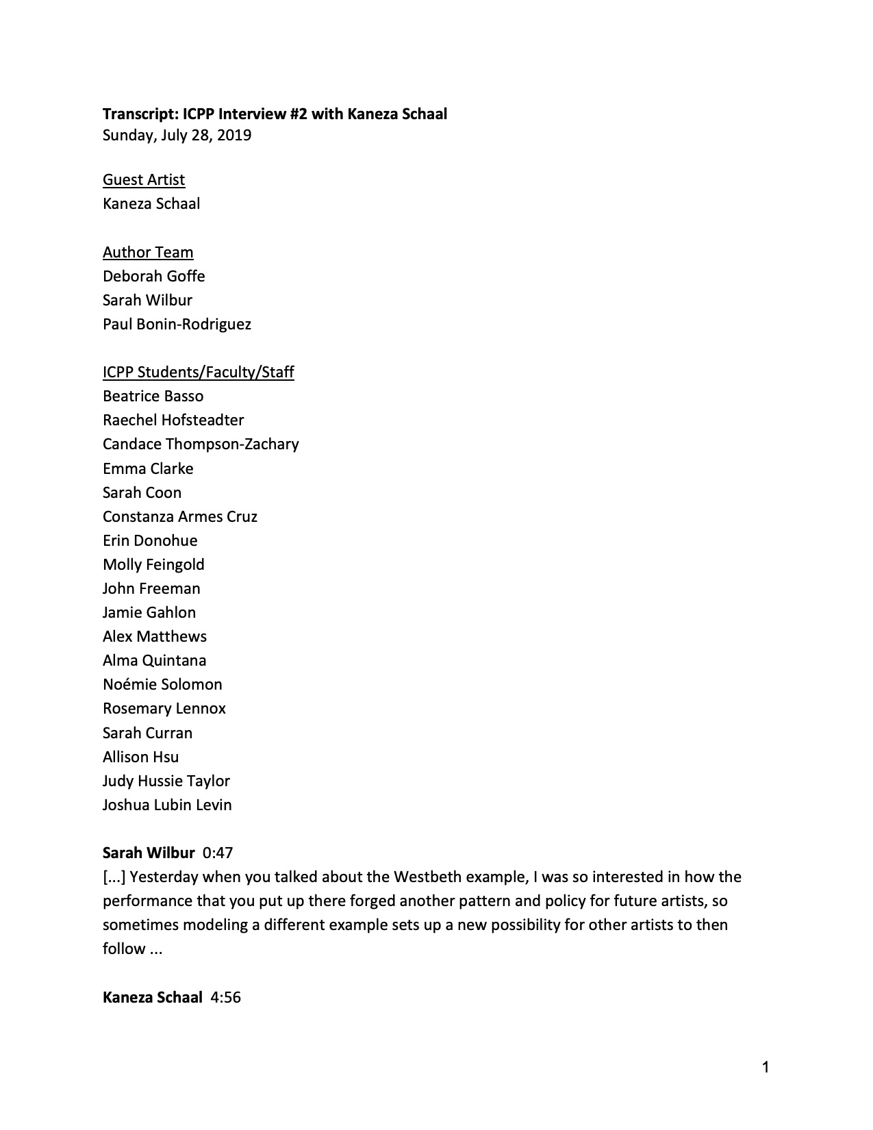 • Interview: ICPP Interview #3 with Kaneza Schaal, Abrons Arts Center, November 9, 2019 (transcript and audio; 1:40:30)